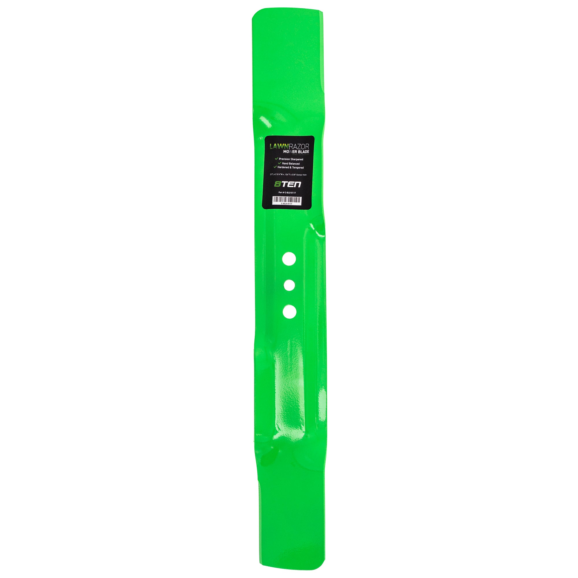 Get the job done right with LawnRAZOR mower blades by 8TEN -- Our blades are manufactured with 10B38 alloy steel, dynamically balanced, entirely heated, precisely sharpened to a 30 degree angle and finally thermoset powder coated. We ensure our lawn mower blades will match or exceed OEM quality at a more affordable price.