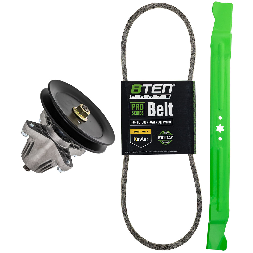 Included in This Kit: (QTY 1) 8TEN 810-CSP2207N Deck Spindle Assembly Substitute For OEM Part Numbers(s): 918-04822, 918-04889, 618-04822, 918-04822A, 918-04950, 918-04889A, 918-04822B, 618-04889, 618-04822A, 618-04889A, 618-04950, 618-04822B (QTY 1) 8TEN 810-CBL2437D LawnRAZOR Mulching Blade Substitute For OEM Part Numbers(s): 942-04385, 742-04385, 490-110-M135 (QTY 1) 8TEN 810-CBL2924T Belt with Kevlar® Substitute For OEM Part Numbers(s): 954-05001, 754-05001, 490-501-C065